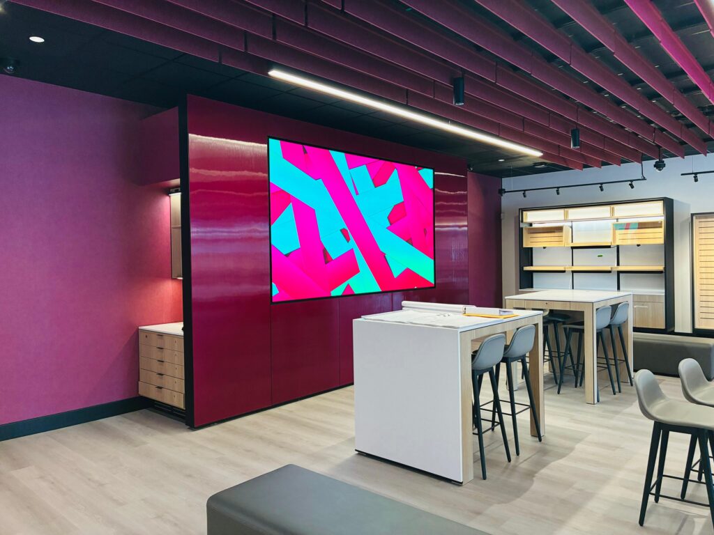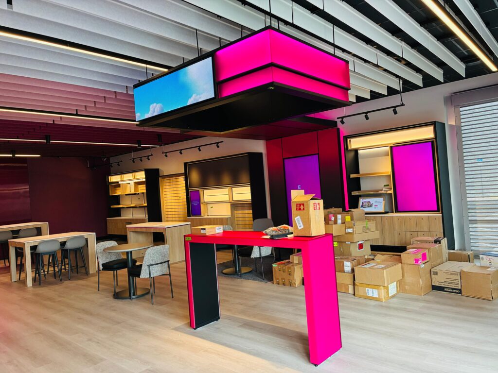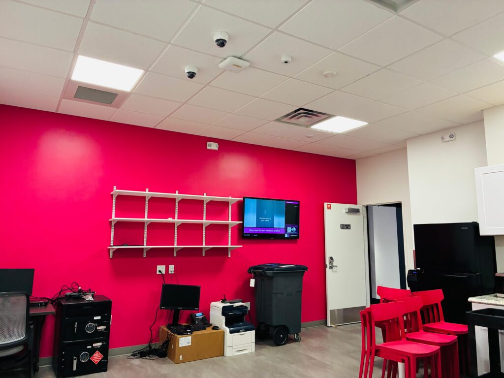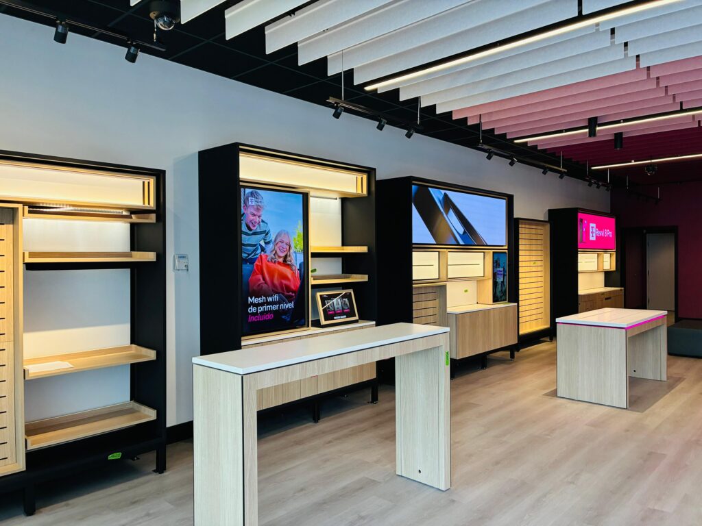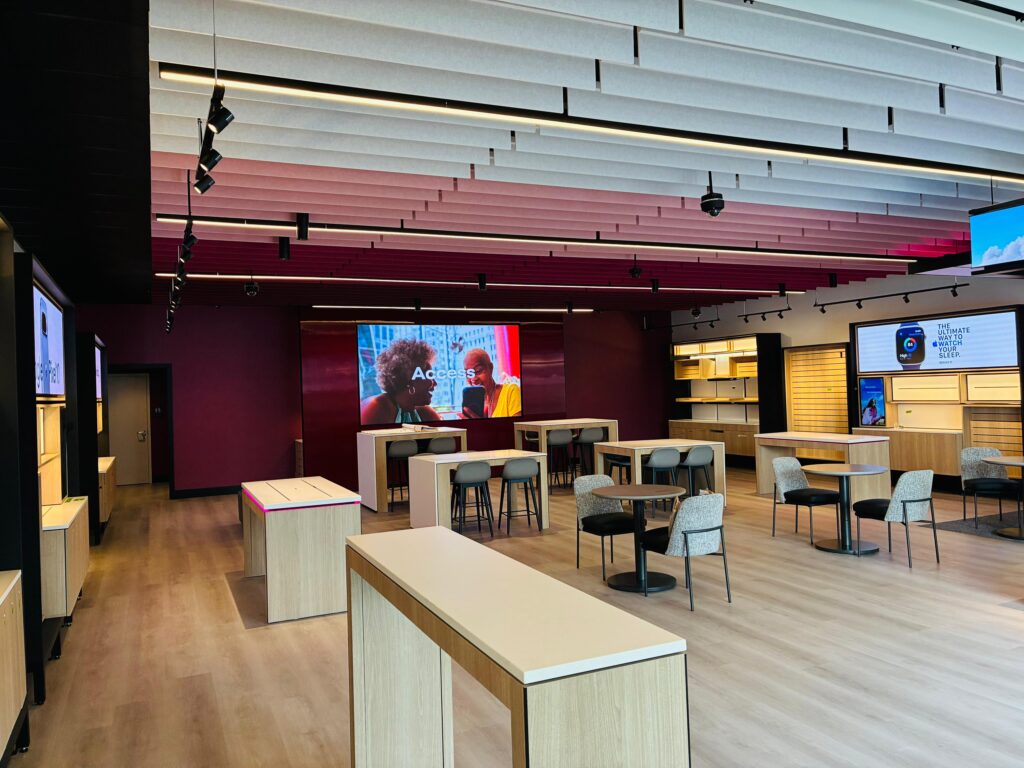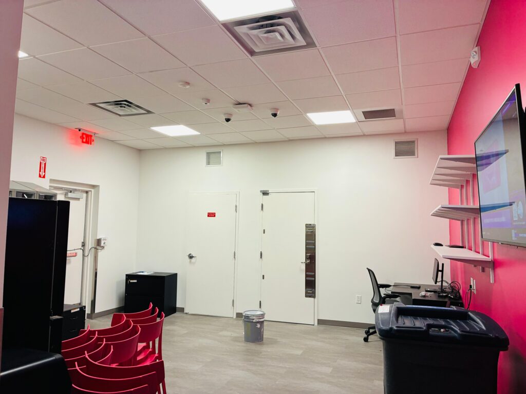 Dabcon completed a modern retail interior build-out for a T-Mobile franchise location. The scope included drywall partitions, specialty ceiling systems, and acoustical ceiling tile installations designed to support a dynamic retail layout. Our execution emphasized clean detailing and alignment with the brand’s vibrant and colored design standards. The finished space delivers both visual impact and functional performance